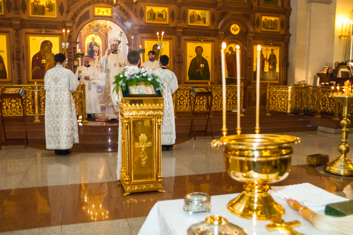 Его Высокопреосвященству сослужили сослужили ключарь Спасо-Преображенского кафедрального собора протоиерей Георгий Сивков, протоиерей Константин Чунчук, первый проректор Хабаровской духовной семинарии иерей Дионисий Проскурин, иерей Сергий Аникин, иерей Виктор Галян, иерей Андрей Мешков.