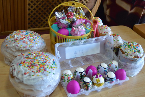 В социальном учреждении на улице Серышева тоже готовились к празднику — пышные красивые куличи, яркие крашеные яйца, веточки вербы, поделки украшавшие снедь.