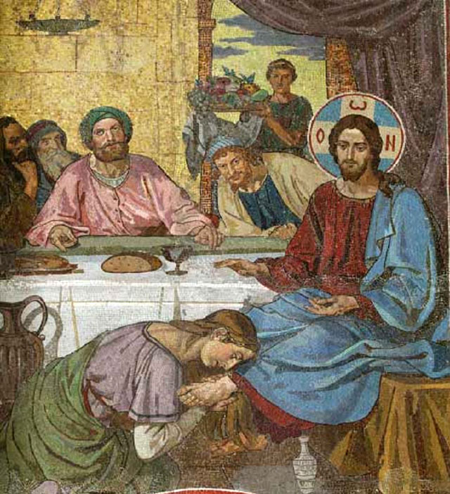 Ночь на среду Господь провел в Вифании. Здесь в доме Симона прокаженного в то время, когда в совете первосвященников, книжников и старейшин было уже решено взять Иисуса Христа хитростью и убить Его — некая жена «грешница» возлила драгоценное миро на главу Спасителя и тем уготовала Его на погребение, как судил Сам Он о ее поступке.