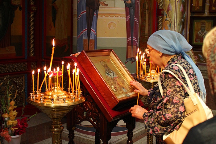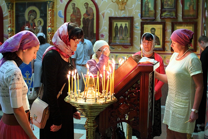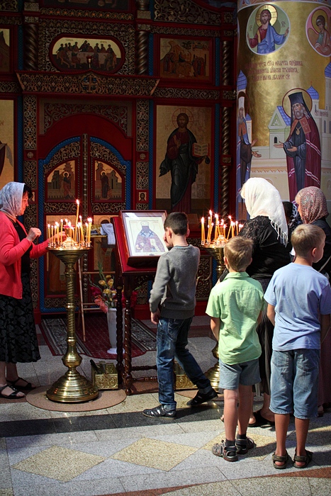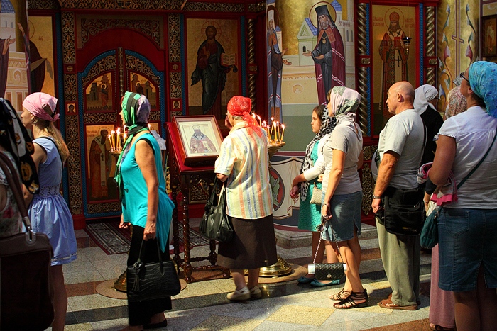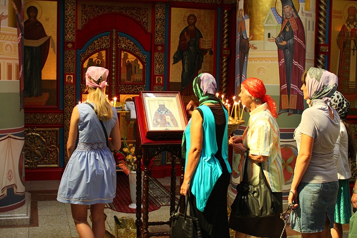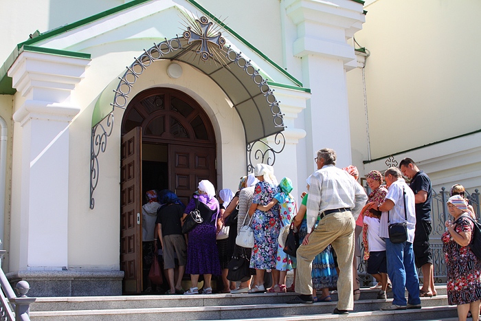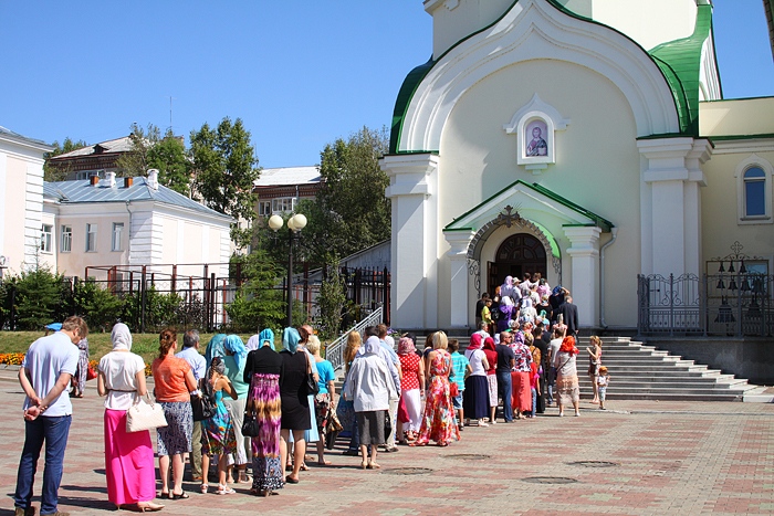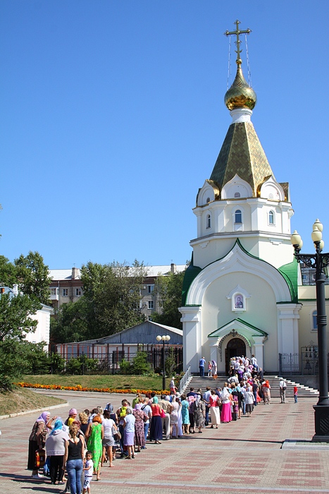 Очередь жителей Хабаровска в домовый храм Хабаровской семинарии к мироточивому образу святителя Иннокентия, митрополита Московского. 24 августа 2014 г.