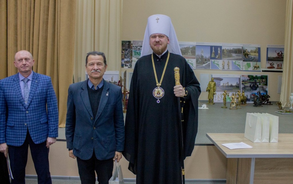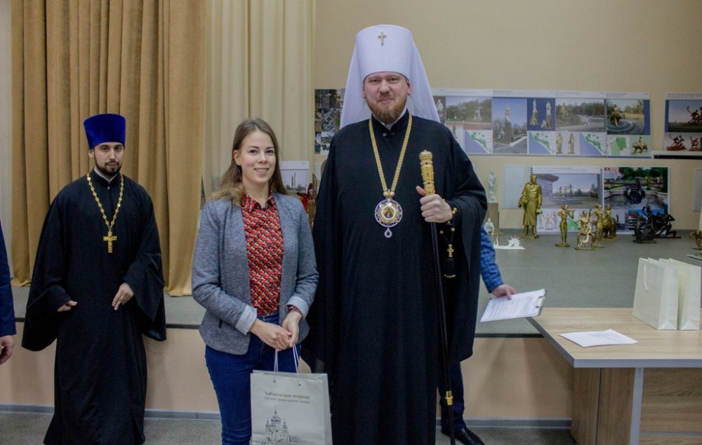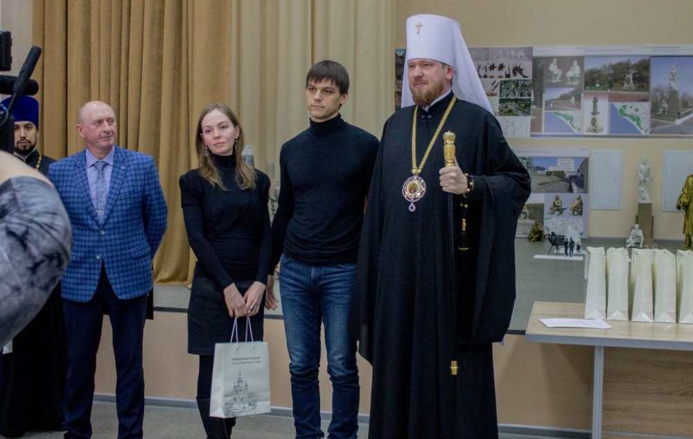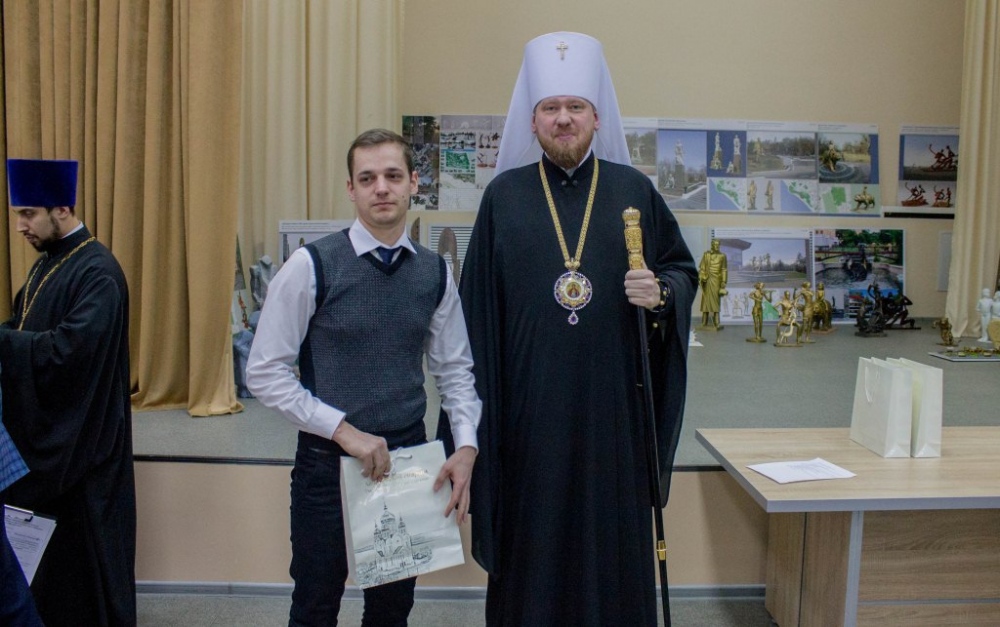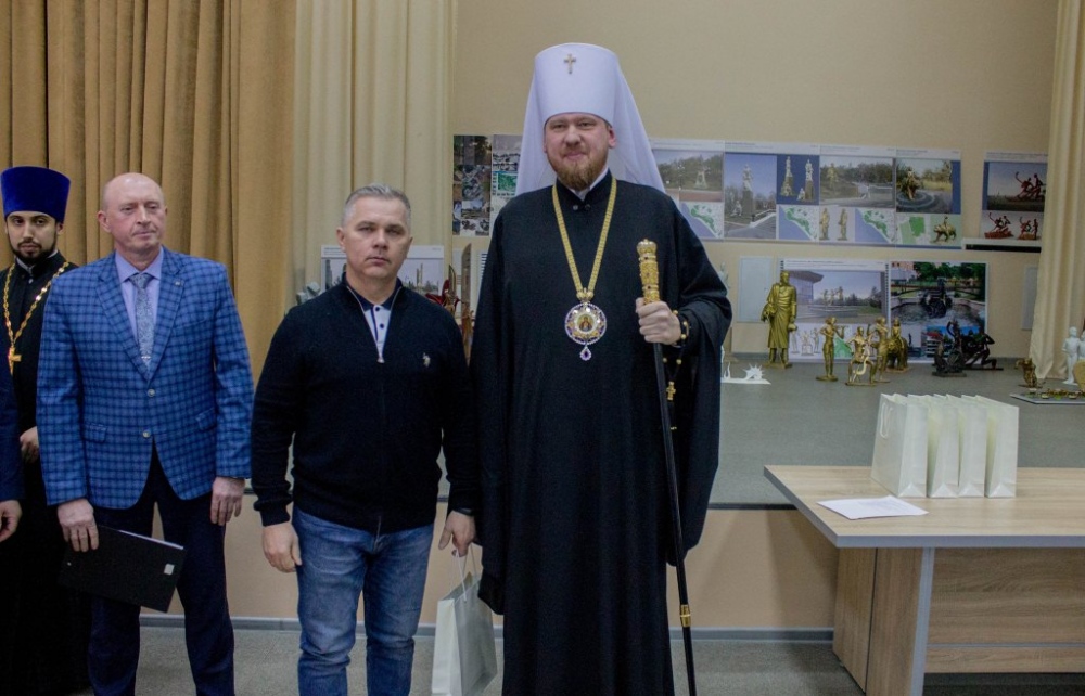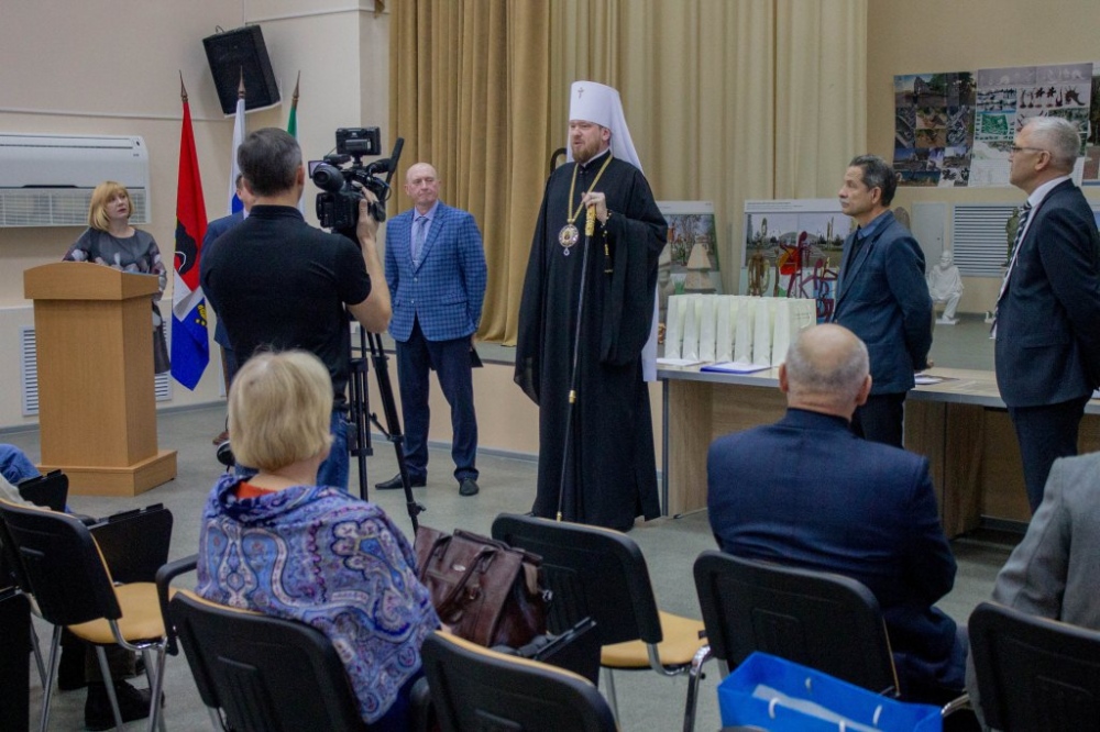 Митрополит Владимир вручил памятные подарки архитекторам, представившим проекты воссоздания Триумфальной арки 12 декабря 2018 г.
